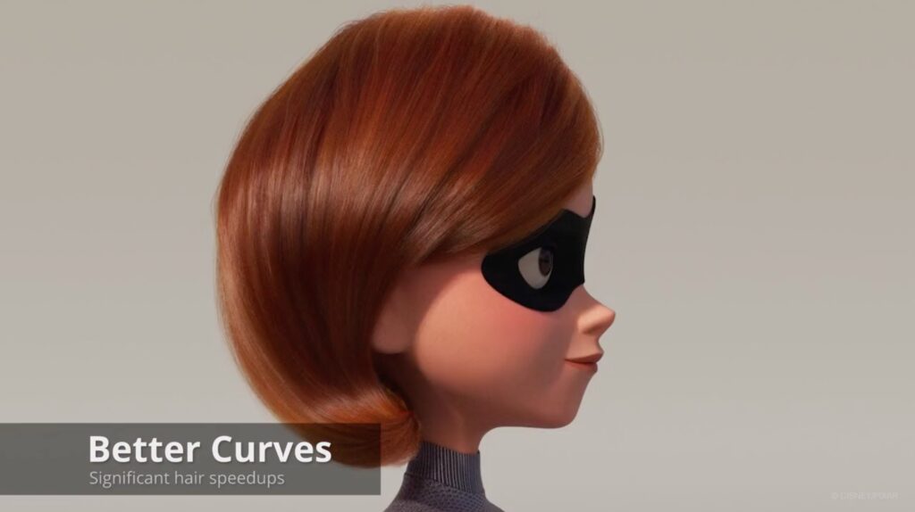 In “The Incredibles 2”, the enhancement of the “curves” (from 2 up to 6 time faster) allowed impressive renderings of hair (in addition of a very realistic hair shader).
